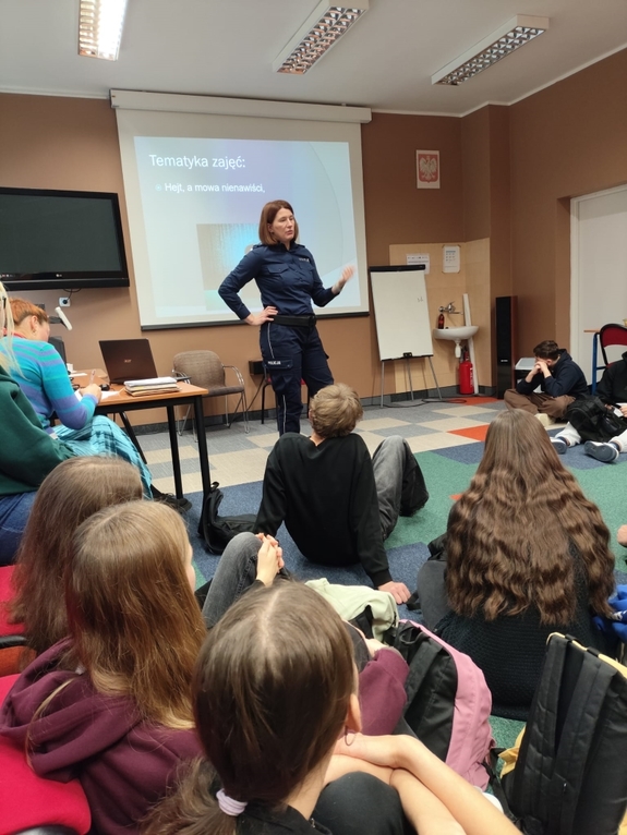 Policjantka odwiedziła Szkołę Podstawową nr 44 w Gdyni – rozmowy o hejcie i odpowiedzialności nieletnich.