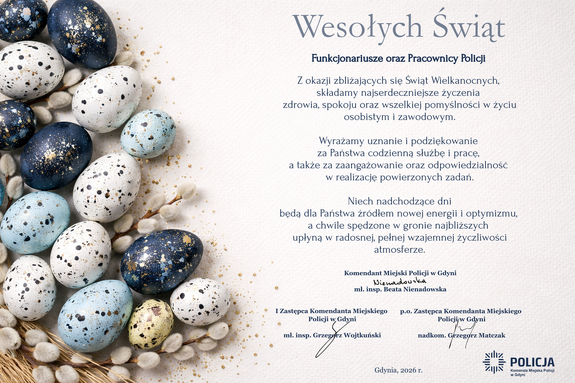 Życzenia Kierownictwa garnizonu gdyńskiego Policji z okazji Świąt Wielkanocnych Data publikacji: 02.04.2026