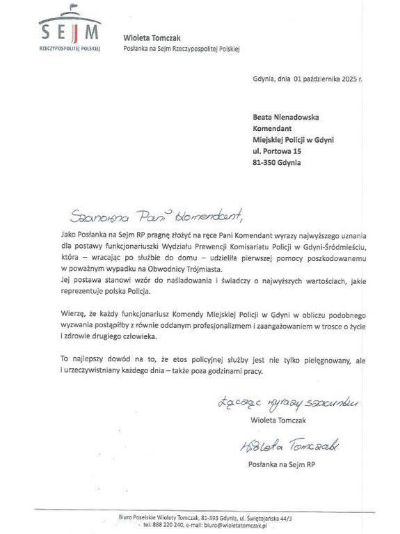 Funkcjonariuszka Wydziału Prewencji Komisariatu Policji w Gdyni – Śródmieściu, wracając po służbie do domu, udzieliła pierwszej pomocy poszkodowanemu w poważnym wypadku na obwodnicy Trójmiasta. Jej profesjonalizm, empatia i gotowość do działania nawet po zakończeniu służby spotkały się z uznaniem posłanki na Sejm RP Wioletty Tomczak, która skierowała oficjalne podziękowania do Komendanta Miejskiego Policji w Gdyni mł. insp. Beaty Nienadowskiej.
