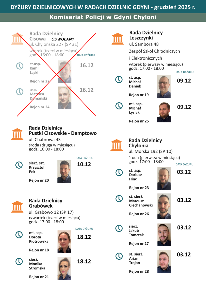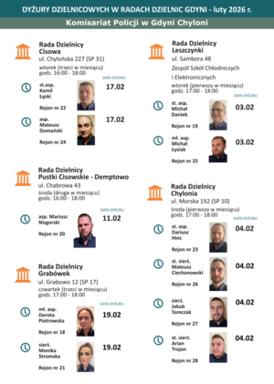 Grafik dyżurów dzielnicowych Komisariatu Policji w Gdyni Chyloni w Radach Dzielnic: