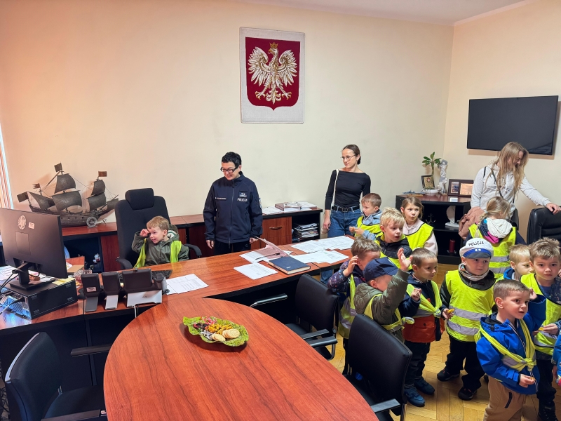 Podczas wizyty przedszkolaki miały okazję zwiedzić budynek komendy, odwiedzić gabinet pani Komendant oraz poznać kulisy codziennej służby funkcjonariuszy. Policjanci opowiedzieli dzieciom o swojej pracy, przypomnieli zasady bezpiecznego poruszania się po drogach, znaczenie noszenia elementów odblaskowych oraz reagowania w sytuacjach zagrożenia. Dużą atrakcją dla najmłodszych był pokaz przygotowany przez technika kryminalistyki, który zaprezentował sposób zabezpieczenia śladów kryminalistycznych i opowiedział o swojej pracy. Dzieci z zaciekawieniem obserwowały sprzęt policyjny i z entuzjazmem uczestniczyły w zajęciach.