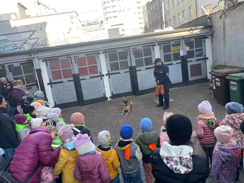 Policjantki z Wydziału Ruchu Drogowego w ciekawy i przystępny sposób opowiadały przedszkolakom o swojej pracy oraz o zasadach bezpieczeństwa poruszania się po ulicy, o tym, jak zachować ostrożność w różnych sytuacjach oraz dlaczego warto zawsze pamiętać o odblaskach. Duże wrażenie na dzieciach zrobiło spotkanie z przewodnikiem psa służbowego. Mali goście mogli zobaczyć pokaz posłuszeństwa i dowiedzieć się, jak ważną rolę odgrywają psy w codziennej pracy policji. Nie zabrakło również zwiedzenia komendy oraz radiowozu. Dzieci z zainteresowaniem oglądały sprzęt policyjny, mogły zajrzeć do środka pojazdu i poczuć się, choć na chwile jak prawdziwi funkcjonariusze.
