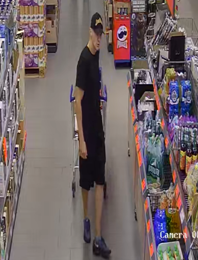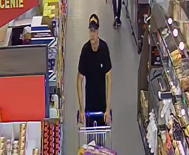 Zdarzenie miało miejsce 09. września 2025 r. w sklepie Aldi przy ul. Kamrowskiego w Gdyni, a związek ze sprawą może mieć mężczyzna, którego wizerunek publikujemy. Na podstawie analizy zabezpieczonego nagrania monitoringu ustalono rysopis sprawcy: jest to mężczyzna w wieku ok. 30 lat, łysy, średniego wzrostu, szczupłej budowy ciała, ubrany w czarną bluzkę z krótkim rękawem z białym logo na lewej piersi, czarne krótkie spodenki, niebieskie buty z czarną podeszwą z białym logotypem firmy "nike" oraz czarną czapkę z daszkiem z żółtym napisem.