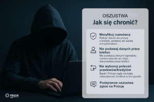 Policja ostrzega przed oszustwami, dokonywanymi poprzez podszywanie się pod pracowników banków lub funkcjonariuszy służb. Sprawcy często powołują się na rzekomy „wyciek danych”, „zablokowane konto” albo konieczność „zabezpieczenia środków”. Ich celem jest nakłonienie rozmówcy do zawierania umów kredytowych, wykonania przelewów lub wpłat w urządzeniach typu bitcoinomat.