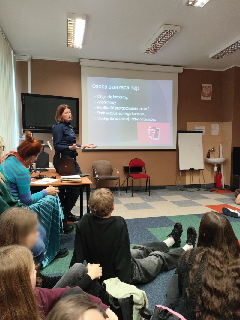 Podczas zajęć funkcjonariuszka tłumaczyła, jakie zachowania w Internecie i w relacjach rówieśniczych mogą prowadzić do odpowiedzialności prawnej, oraz dlaczego granica między „żartem” a czynem karalnym bywa bardzo cienka. Uczniowie mieli możliwość zadawania pytań i omawiania sytuacji, które zdarzają się w ich otoczeniu – w tym przejawów hejtu, cyberprzemocy czy presji grupy. Policjantka podkreśliła, jak ważna jest empatia, reagowanie na krzywdzące zachowania oraz świadomość konsekwencji podejmowanych decyzji. Zwróciła też uwagę, że młode osoby zawsze mogą liczyć na wsparcie Policji, nauczycieli i dorosłych opiekunów.