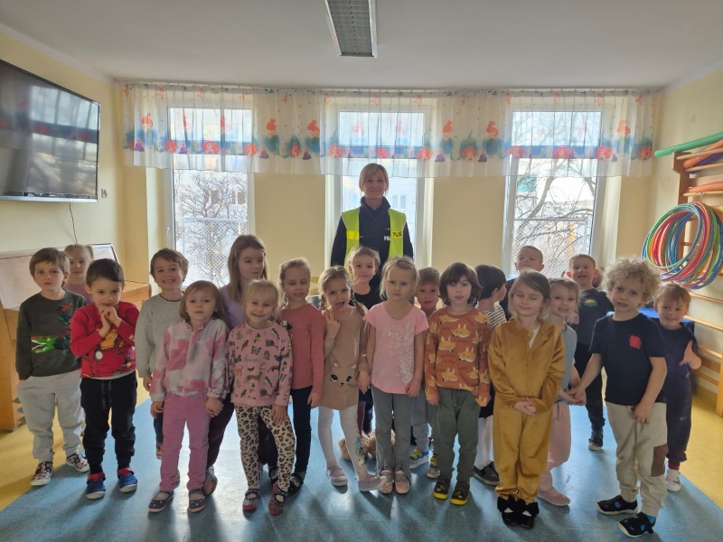 Szczególną uwagę poświęcono znaczeniu noszenia elementów odblaskowych. Przedszkolaki dowiedziały się, dlaczego odblaski zwiększają widoczność po zmroku i w trudnych warunkach oraz w jaki sposób mogą realnie wpłynąć na poprawę bezpieczeństwa pieszych. Spotkanie miało formę rozmowy z aktywnym udziałem dzieci, co sprzyjało utrwalaniu właściwych nawyków.