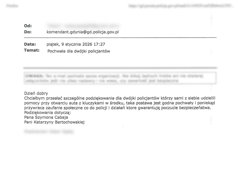 Czasem wystarczy kilka dobrych słów, by docenić czyjąś postawę. Mieszkaniec Gdyni postanowił podziękować policjantom z Komisariatu Policji w Gdyni Chyloni za pomoc w codziennej sytuacji, podkreślając ich życzliwość, zaangażowanie i podejście, które buduje zaufanie do Policji.
