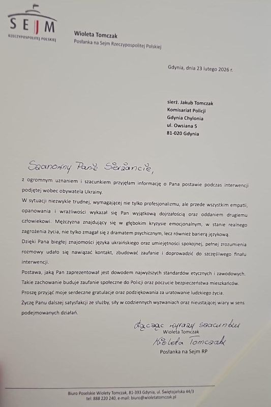 Wioleta Tomczak, posłanka na Sejm Rzeczypospolitej Polskiej, wystosowała list gratulacyjny dla sierż. Jakuba Tomczaka, doceniając jego postawę podczas nietypowej interwencji, podjętej wobec obywatela Ukrainy, który znajdował się w kryzysie emocjonalnym. Jak podkreślono w liście, sytuacja wymagała nie tylko profesjonalizmu, lecz przede wszystkim empatii, opanowania i wrażliwości. Dzięki biegłej znajomości języka ukraińskiego oraz umiejętności spokojnego prowadzenia rozmowy funkcjonariuszowi udało się nawiązać kontakt z mężczyzną, zbudować zaufanie i doprowadzić interwencję do szczęśliwego zakończenia. Posłanka przekazała funkcjonariuszowi gratulacje oraz wyrazy uznania za uratowanie ludzkiego życia, życząc mu dalszych sukcesów i satysfakcji ze służby oraz siły w codziennych wyzwaniach.