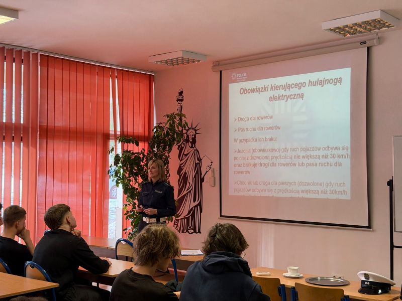 Podczas zajęć omówiono najczęstsze zagrożenia w ruchu drogowym z udziałem młodych uczestników ruchu. Funkcjonariusze przypomnieli podstawowe przepisy regulujące poruszanie się pieszych, rowerzystów oraz użytkowników hulajnóg, zwracając szczególną uwagę na odpowiedzialność, przewidywanie zagrożeń i konsekwencje nieprzestrzegania przepisów prawa. Uczniowie analizowali przykładowe sytuacje drogowe i dzielili się własnymi doświadczeniami. Tego rodzaju działania stanowią ważny element edukacji komunikacyjnej oraz budowania świadomości prawnej młodzieży.