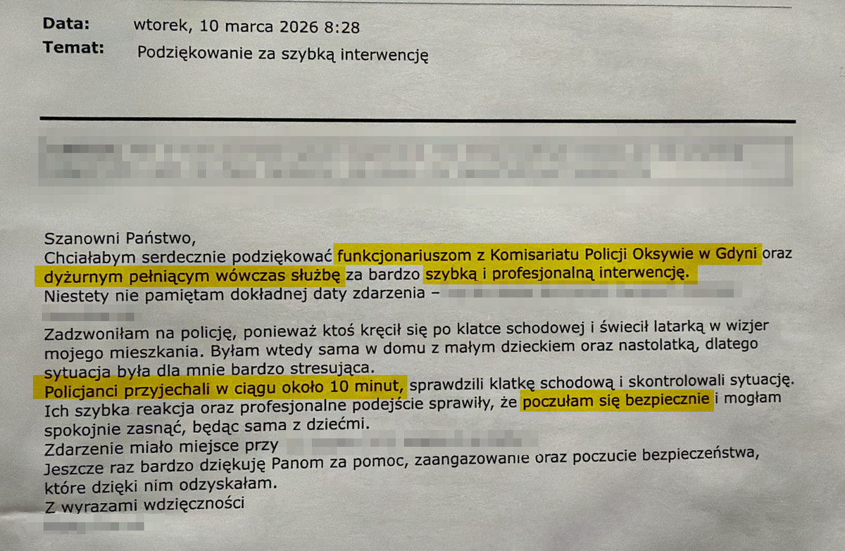 Do Komendy Miejskiej Policji w Gdyni wpłynął mail z podziękowaniami dla funkcjonariuszy z Komisariatu Policji w Gdyni Oksywiu oraz dyżurnych, którzy pełnili wówczas służbę. Autorka wiadomości podkreśla profesjonalizm, zaangażowanie i błyskawiczną reakcję policjantów, dzięki którym w stresującej sytuacji mogła znów poczuć się bezpiecznie we własnym domu.